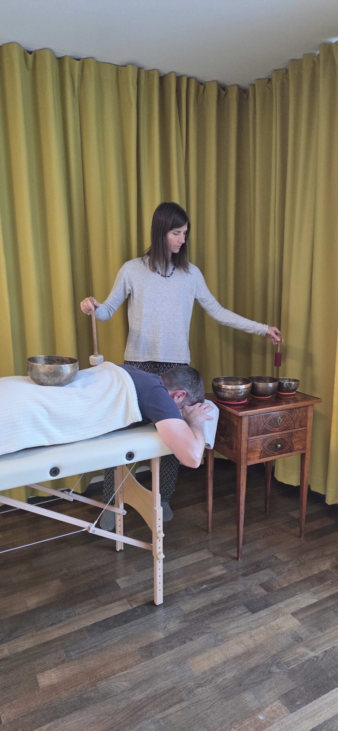 Einige Schalen werden während dem Liegen, neben dem Körper und gewisse auch auf dem Körper angeschlagen. Die beruhigende Schwingung der Klangschalen verhilft dabei, Verspannungen zu lösen, den Geist zu beruhigen und den Körper mit neuer Energie zu füllen.
