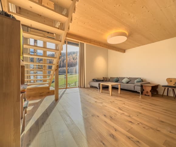 Das Herzstück des Hauses ist der offene Wohn- und Essbereich mit Panoramafenstern, die einen atemberaubenden Blick auf die umliegende Bergwelt bieten. Die grosszügige Küche ist mit hochwertigen Geräten ausgestattet und verfügt zusätzlich auch über einen Holzherd, der für eine warme und einladende Atmosphäre sorgt.